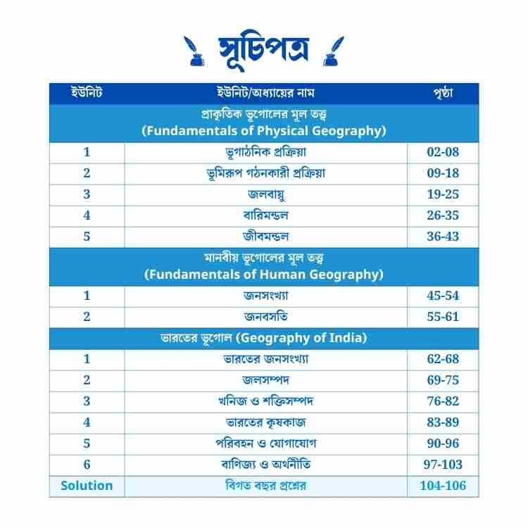 নতুন সিলেবাসের প্রতিটি অধ্যায় নিখুঁতভাবে কভার করা হয়েছে। ভূমিরূপ গঠনকারী প্রক্রিয়া থেকে শুরু করে জনসংখ্যা ও জনবসতি—কোনো গুরুত্বপূর্ণ অংশই বাদ দেওয়া হয়নি।